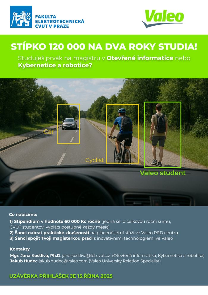 Jsi student/ka prvního ročníku magisterského programu Otevřená informatika? Máš vášeň pro technologie, jde Ti matematika, fyzika či programování a zajímáš se o vývoj samoříditelných aut? Pokud jsou Tvé odpovědi ANO, tak je VALEO CTU SCHOLARSHIP určené přesně pro Tebe!